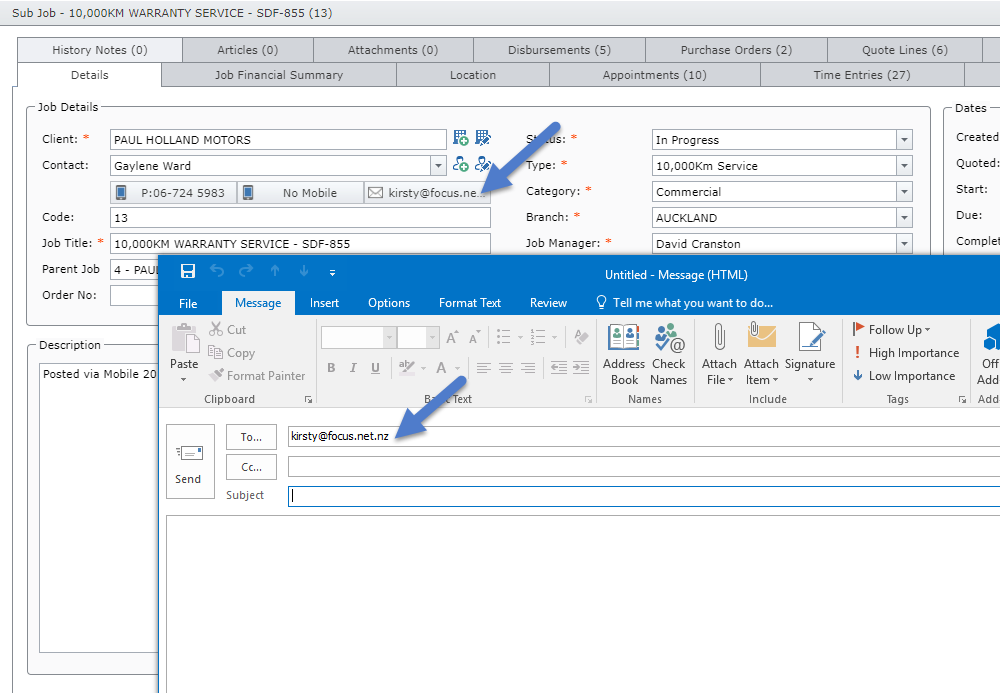 Clicking the email address button will open your default email client with the contact's email address in the to field allowing you to quickly email the job contact.