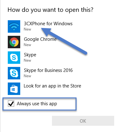 Will provide you with a list of applications to open the phone number in– leave “Always use this app” ticked on if you would like this application to be your default.