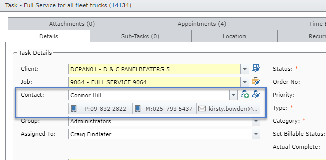 As per below, against the job the assigned contact’s phone number, mobile number and email address are available to view as buttons directly under the contact name.