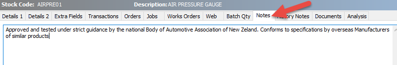 The notes tab against this Stock Code then has some text entered in it: