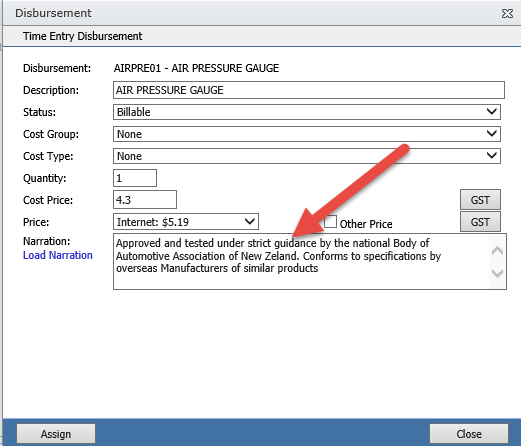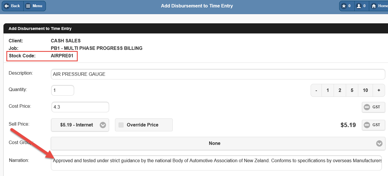 This Stock Code is a disbursement available in TimeTrak, and when this disbursement is selected in either Timetrak Mobile or TimeTrak Professional the narration from the notes tab is automatically brought through as per below: