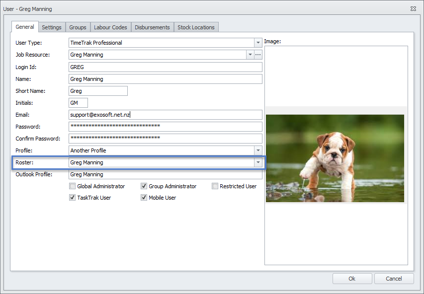 Back against the user set up under the labour codes tab the roster class is then assigned to each labour code.