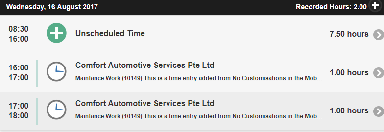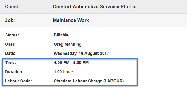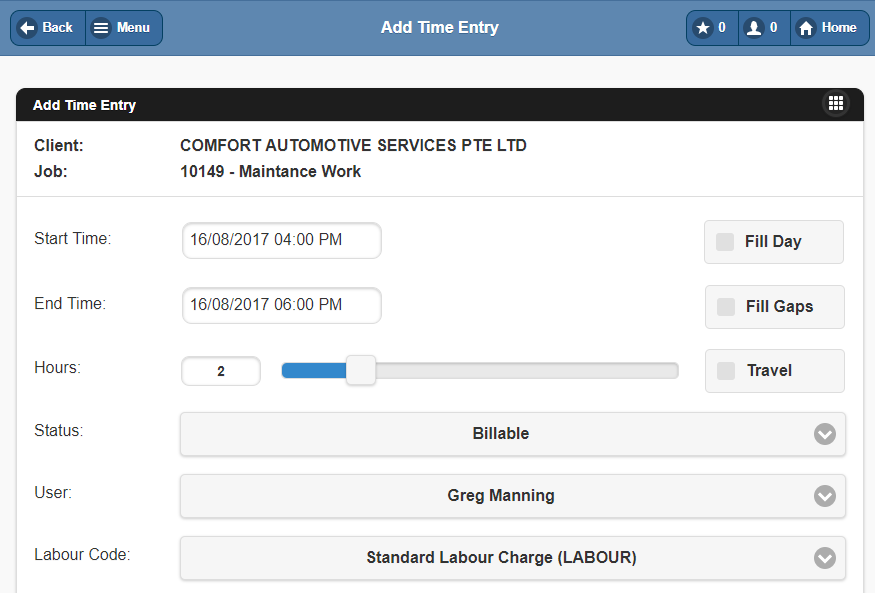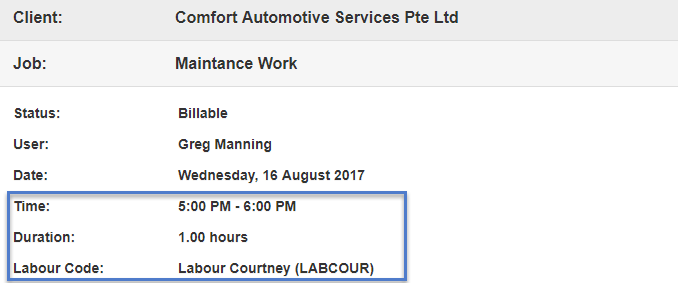 When Greg enters a time entry on Wednesday for 4pm – 6pm as per below he is not required to alter the labour code.