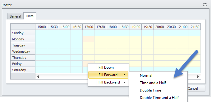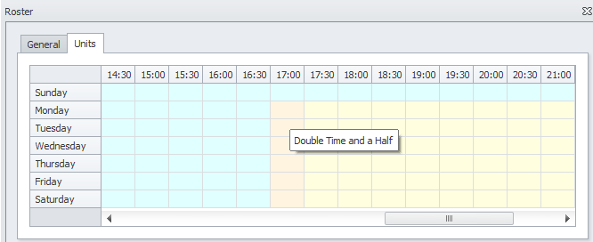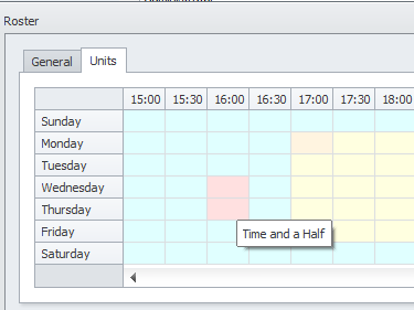 Against the Units tab of a roster you can then set half hour time blocks which stipulate which roster class will be used at this time.