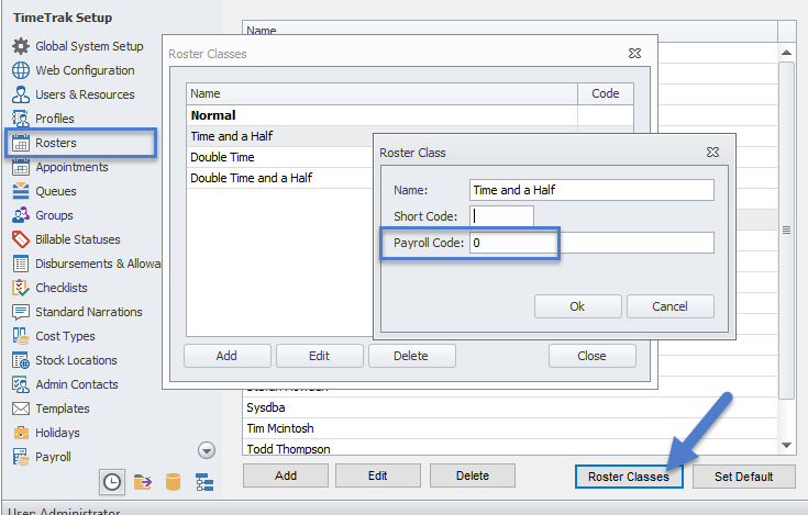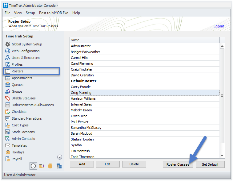 These Roster Classes are set up and can be maintained in the TimeTrak Administrator Console under the Rosters menu, Roster Classes as per below: