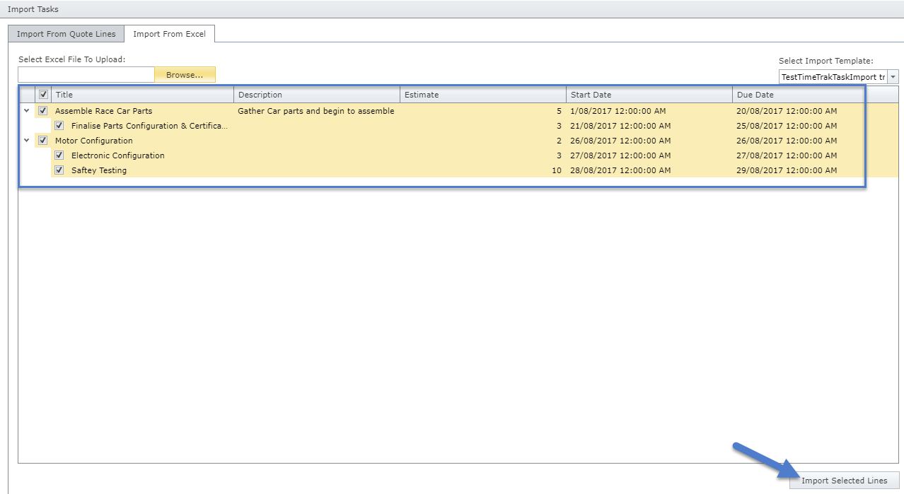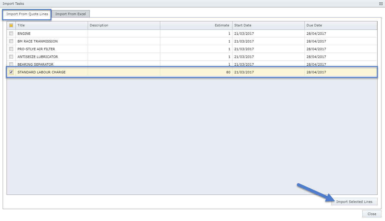 Select the lines you wish to create into tasks and click “Import Selected Lines”.