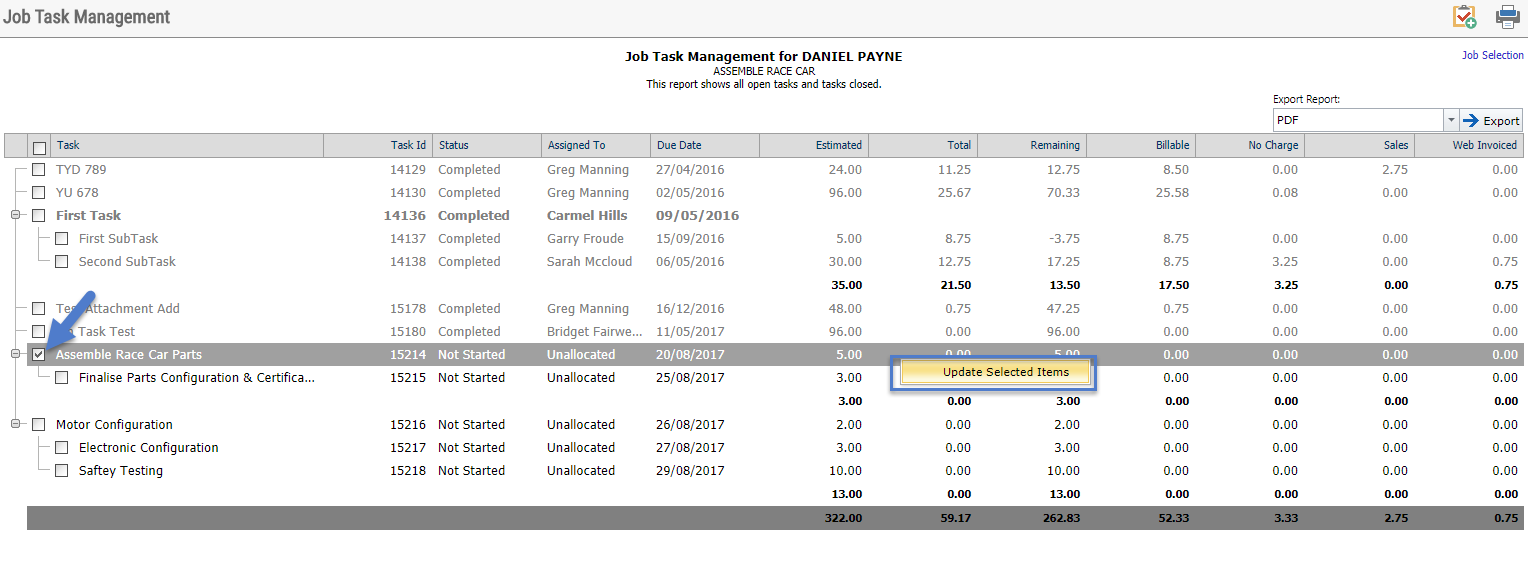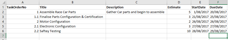 Please note: The TaskOrderNo field is a reference to the Task/ Sub Task relationship. In this example, Assemble Race Car Parts was a task with Finalise Parts Configuration & Certification as a sub task there for the TaskOrderNo field was populated with 1 and 1.1.