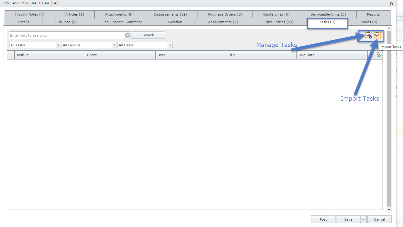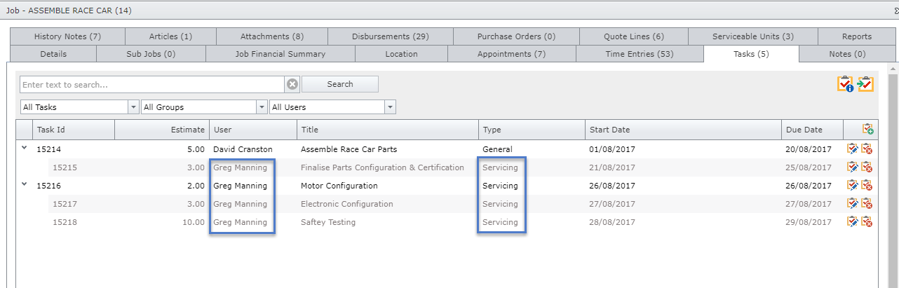 Which will create the tasks against the job. Users can then click the Manage Tasks Icon as per below:
