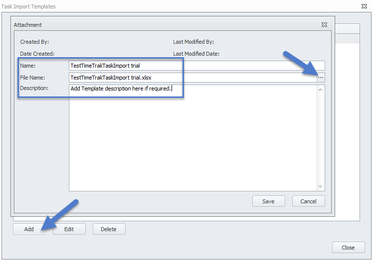 Browse to the file location of the saved Excel template that was created – Name the Import Template and add a description, if required.