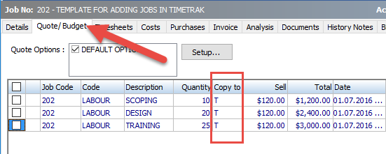 Create a TimeTrak Template Job with basic Job details in Job Costing in the quote/ budget tab of the Job split the three Tasks and ensure ‘Copy to’ is set to ‘T’ (Time) as per below: