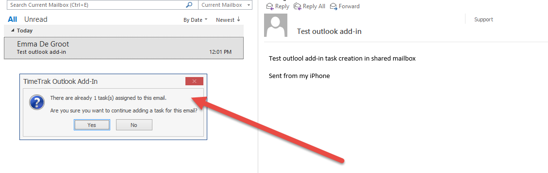When the Outlook Add-in is used to create a task from an email, if someone else tries to create a task from the same email they will get the below notification message:
