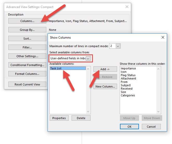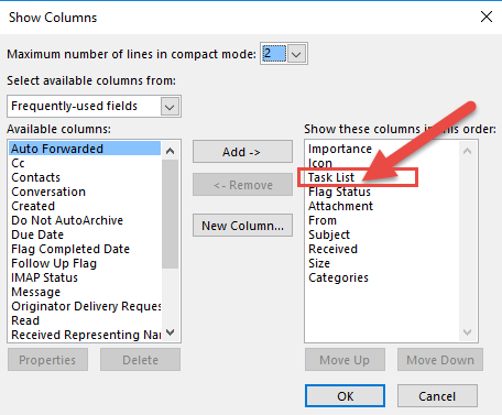 Ensure the task list is high on the column order – click OK