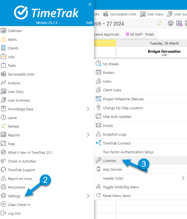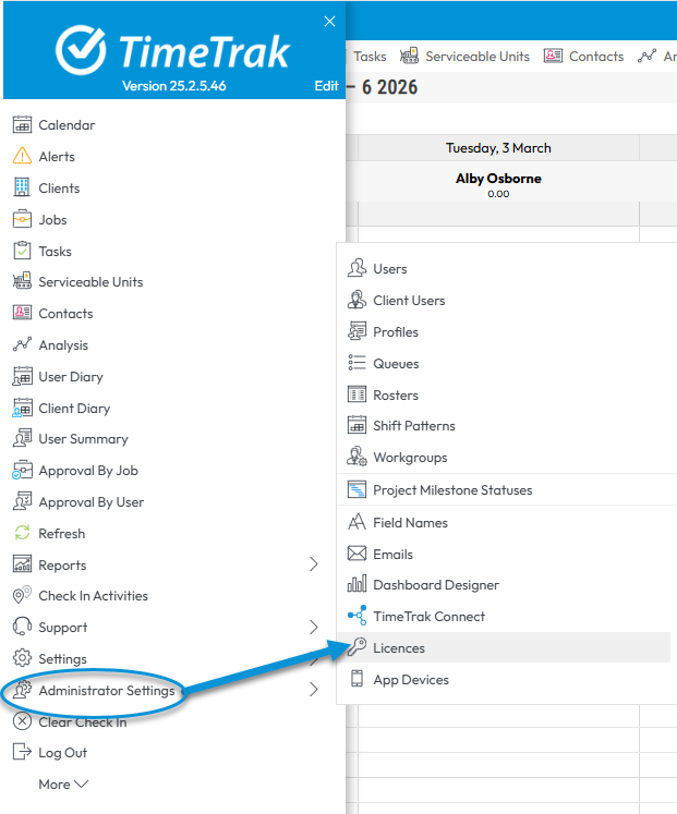 From TimeTrak Version 25.2, Licences can be found under Administrator Settings