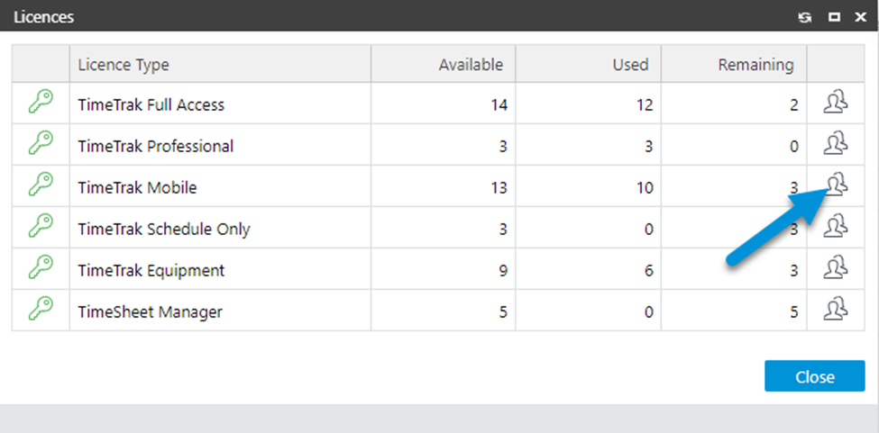 This feature simplifies license management, enabling administrators to adapt to changing needs efficiently without the need for TimeTrak Support Staff to apply additional licencing.
