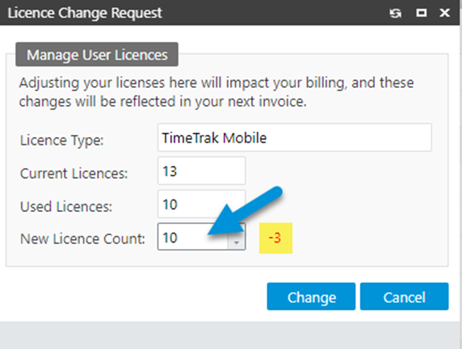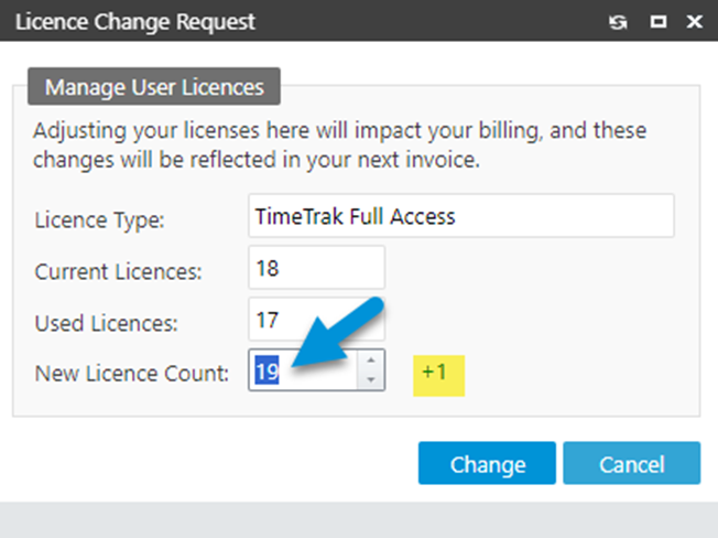 5. Click “Change” to apply the adjustments. Your licence changes will be applied automatically providing the ability to add additional users.