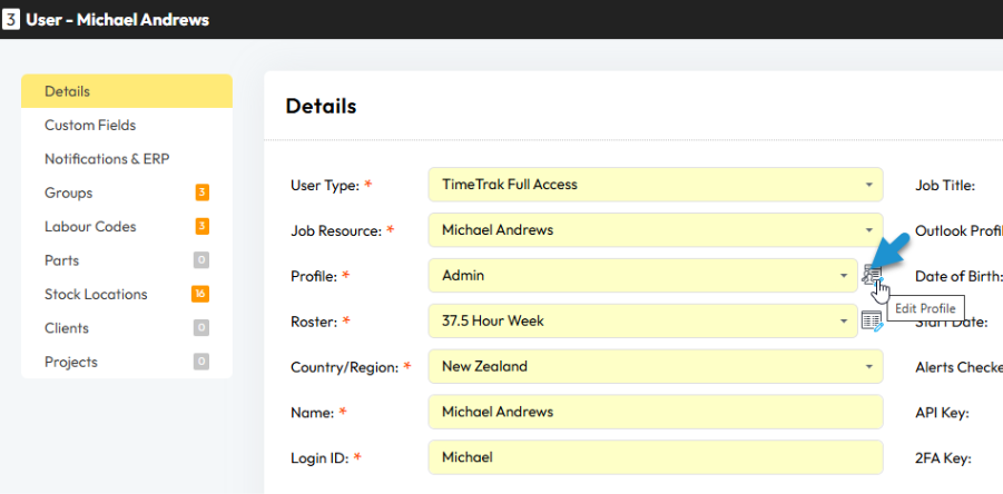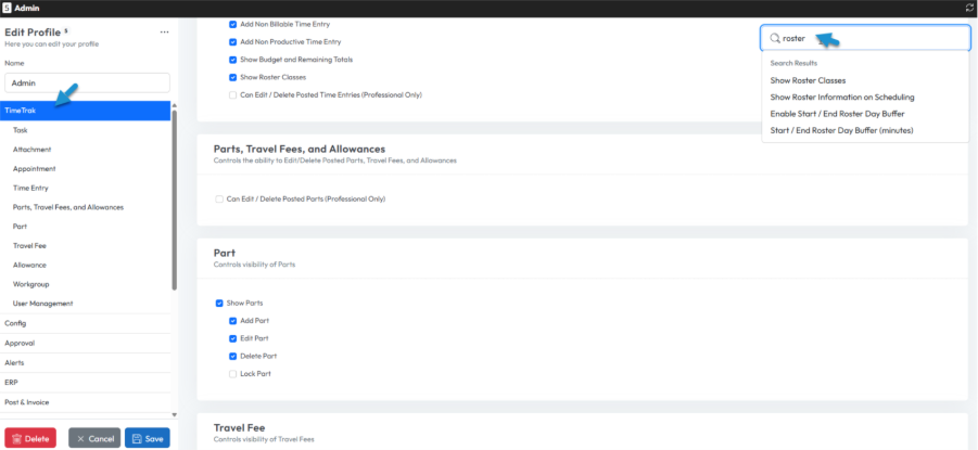 Profile management is still the same as within the TimeTrak Admin console with profile tabs and subheadings now displaying on the left-hand side like other items within TimeTrak. The ability to search for profile settings is also still available via a search control in the top right-hand corner as per below: