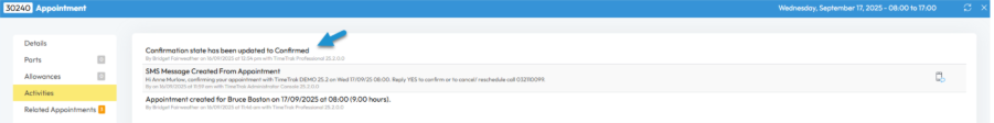 An activity will be added to the appointment(s) related to this confirmation specifying the confirmation state has been updated.
