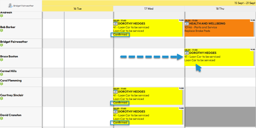 For example, in the scenario below, Bob, Bruce, Courtney, and David were all scheduled for appointments on Wednesday, with their confirmation status marked as “Confirmed.” When Bruce’s appointment is moved to Thursday, the system automatically removes the confirmation status. This enables a scheduled SMS reminder to be sent to facilitate client confirmation for the new appointment time.
