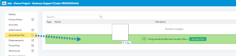 In Professional, the process of adding files to the Acumatica File Tab offers functionality similar to TimeTrak Attachments, including both drag-and-drop and browse options.