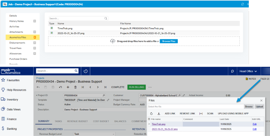 Real-Time Sync and Removing File Links: Files added in TimeTrak or Acumatica are instantly visible in both systems, ensuring seamless collaboration.