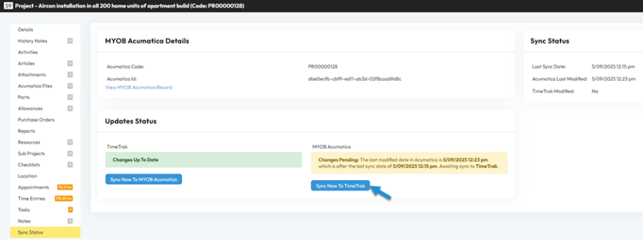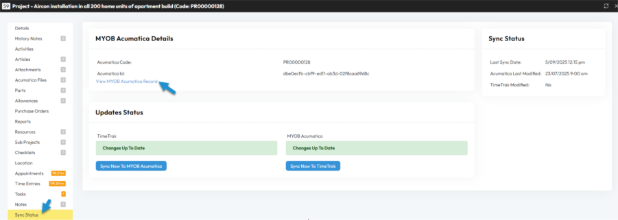 For clients using TimeTrak integrated with MYOB Acumatica in TimeTrak Professional, a Sync Status tab is available for the following: