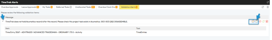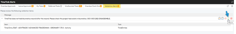 Clients using TimeTrak with MYOB Acumatica typically have Validation Alerts enabled, allowing Professional users to view items that failed validation during the sync process from with the TimeTrak alerts screen.