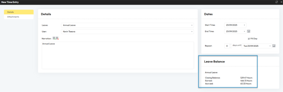 For TimeTrak and MYOB Acumatica Payroll users, this release lets you view leave balances when entering leave through TimeTrak Professional or the APP. To enable this, map Acumatica Entitlement IDs to leave codes in TimeTrak.
