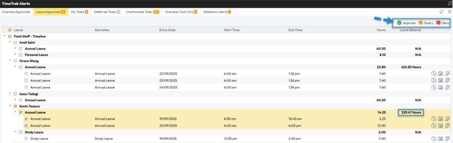 The Leave Approvals screen in TimeTrak Professional has been enhanced with the following updates: