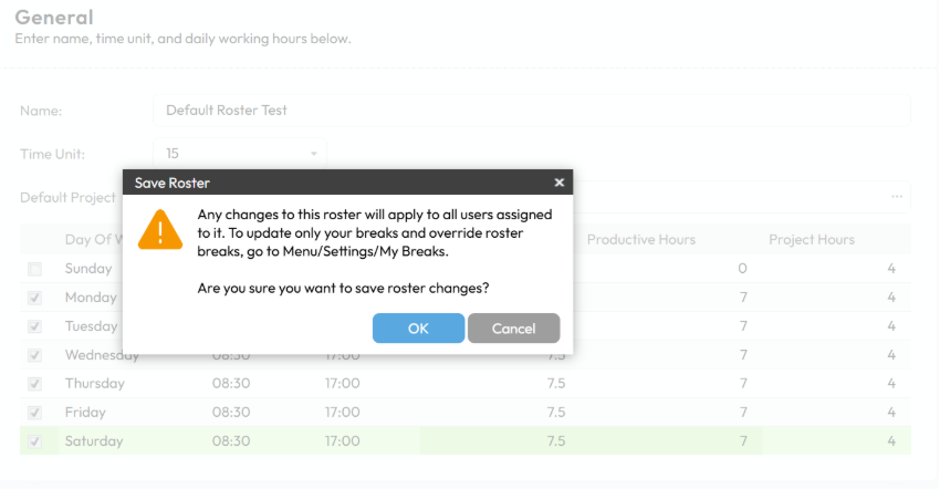 Starting with TimeTrak version 25.2, a confirmation prompt has been added when editing a roster. This prompt notifies users that the changes they are about to save will affect all users assigned to the selected roster, allowing them to confirm or cancel the action before the changes are applied.