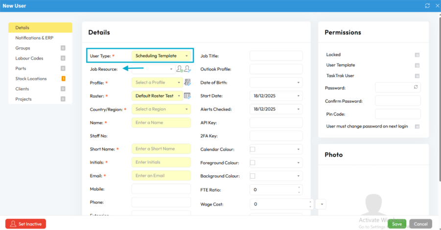 From version 25.2, the Job Resource field is no longer required when creating a new scheduling template user or editing existing user assigned to the scheduling template licence type.