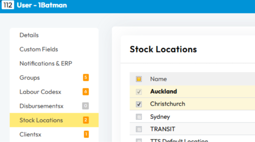 The below user ‘1 Batman’ has access to the stock location Auckland and Christchurch with Auckland being the users default stock location: