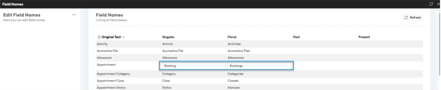 This area allows you to manage field names across the entire site; for example, you can rename “Appointment” to “Booking” as per below:
