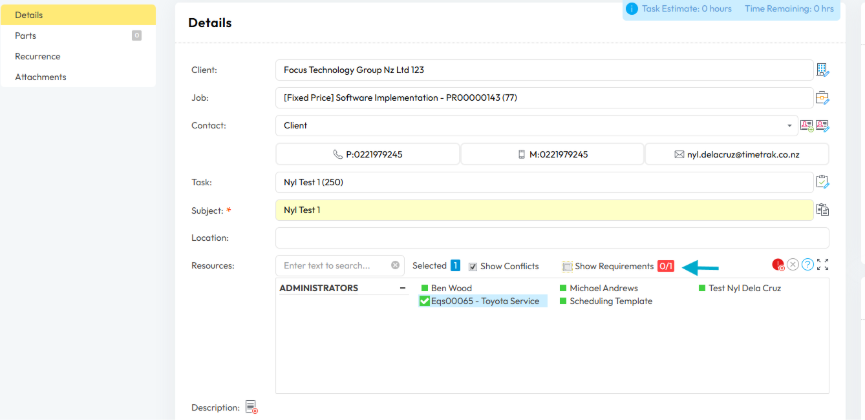 When scheduling in TimeTrak Professional, if certification requirements exist on a selected equipment user, client, job (project) and task a new Show Requirements option is displayed.