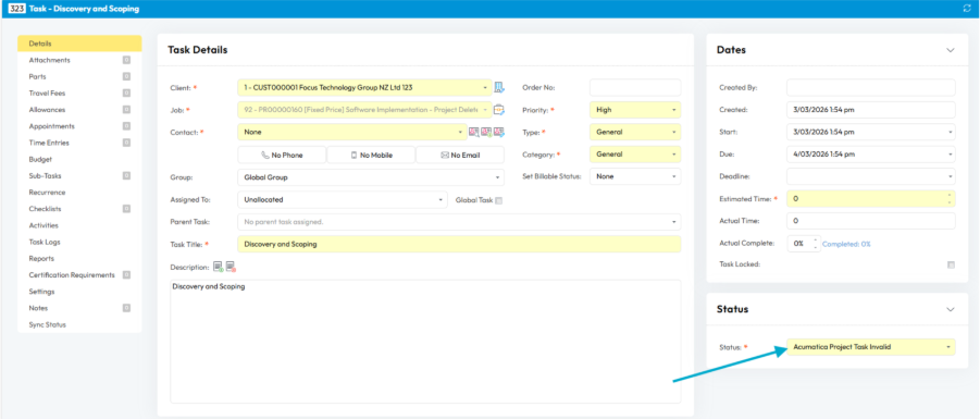 Tasks created from a task template that is mapped to an Acumatica Common Task will be added to MYOB Acumatica via the API, referencing the Common Task to ensure all required values are correctly set on creation.