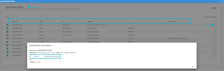 TimeTrak 26.1 introduces a comprehensive, tamper‑resistant audit logging framework that records all authentication attempts across the TimeTrak platform, including: