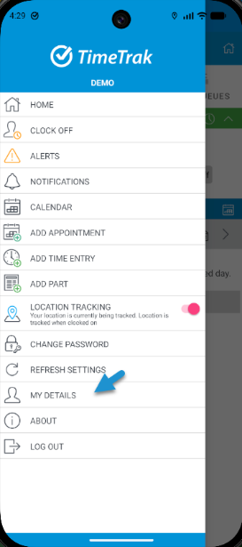 “My Details” Menu Item A new My Details option has been added to the TimeTrak App menu under Settings.
