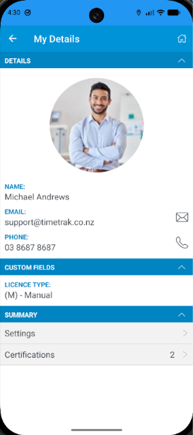 A new My Details section is now available in the TimeTrak App, allowing users to easily view (and optionally edit) their personal information and selected user‑level custom fields.