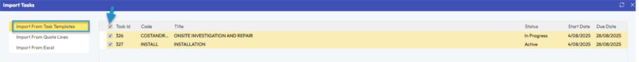 However, when working against a job (project) in TimeTrak Professional, the Import Tasks functionality now supports Task Templates, allowing multiple task templates to be quickly added to a job (project) in one action.