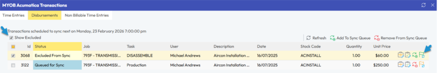 Disbursements All stock and non‑stock disbursements recorded in TimeTrak that are marked as posted and ready to sync to MYOB Acumatica via the API.