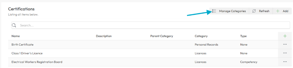 Note: Categories cannot be deleted while certifications are assigned. Certifications must be removed or reassigned first