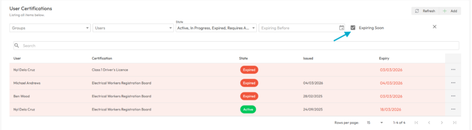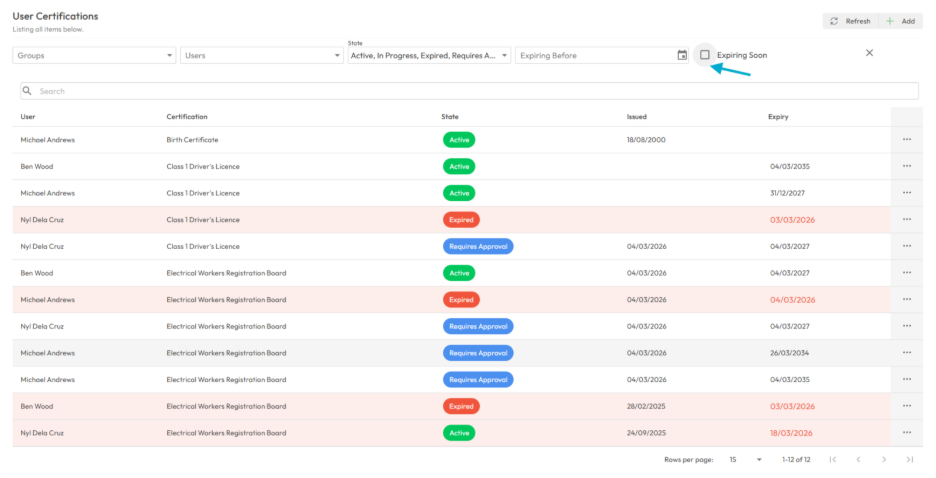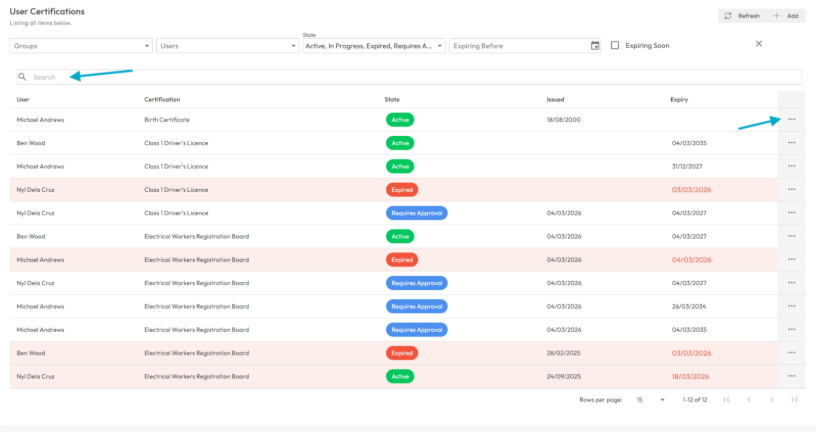 This method is ideal for quickly accessing certifications that require immediate attention, such as those needing updates or competency adjustments.