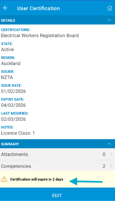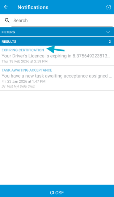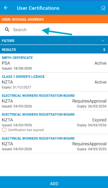 In addition to the reminder notification, a red count of all certifications for the logged in user which are expired or within the configured alert period be displayed against certifications in the search view of the APP as per below as a visual reminder of upcoming certification expiry’s.