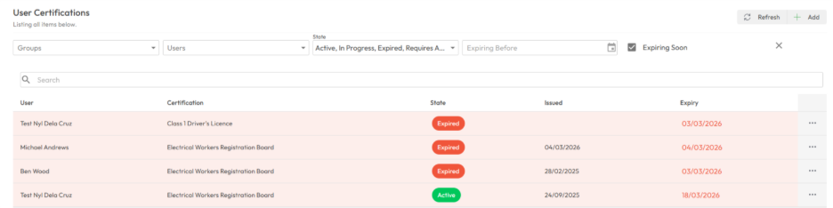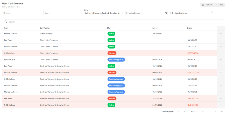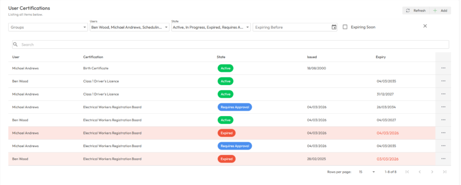 Why Certifications Matter For many organisations, compliance depends on having the right people and the right equipment assigned to each job. Expired licences, missing training, or incorrect equipment allocation can expose organisations to: