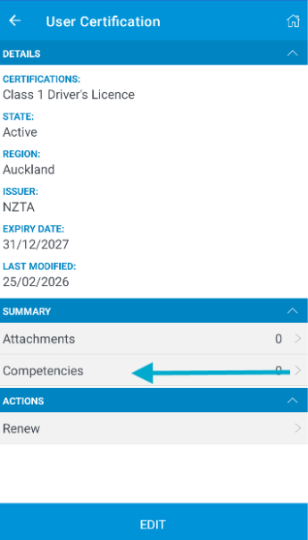 Where enabled, users can view and manage the competency records associated with their own certifications directly within the TimeTrak App. This allows field staff and technicians to easily review competency requirements and keep their records up to date.
