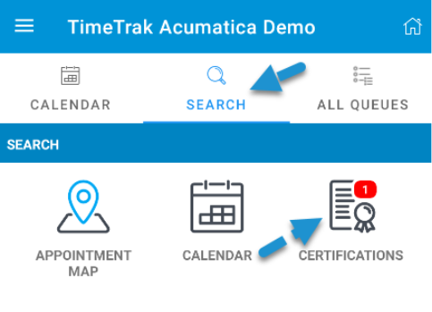 A faster way to manage your certifications in the TimeTrak App is to use the Search function from the home screen: