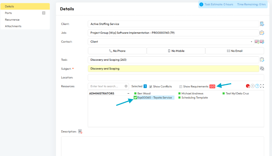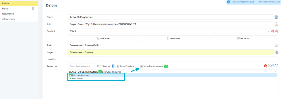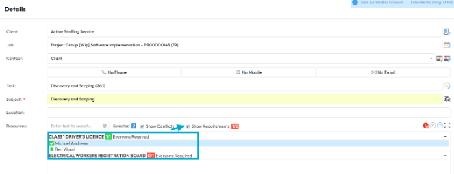When certification requirements exist on a Client, Job, Task, or selected Equipment, a Show Requirements option becomes available on the appointment.