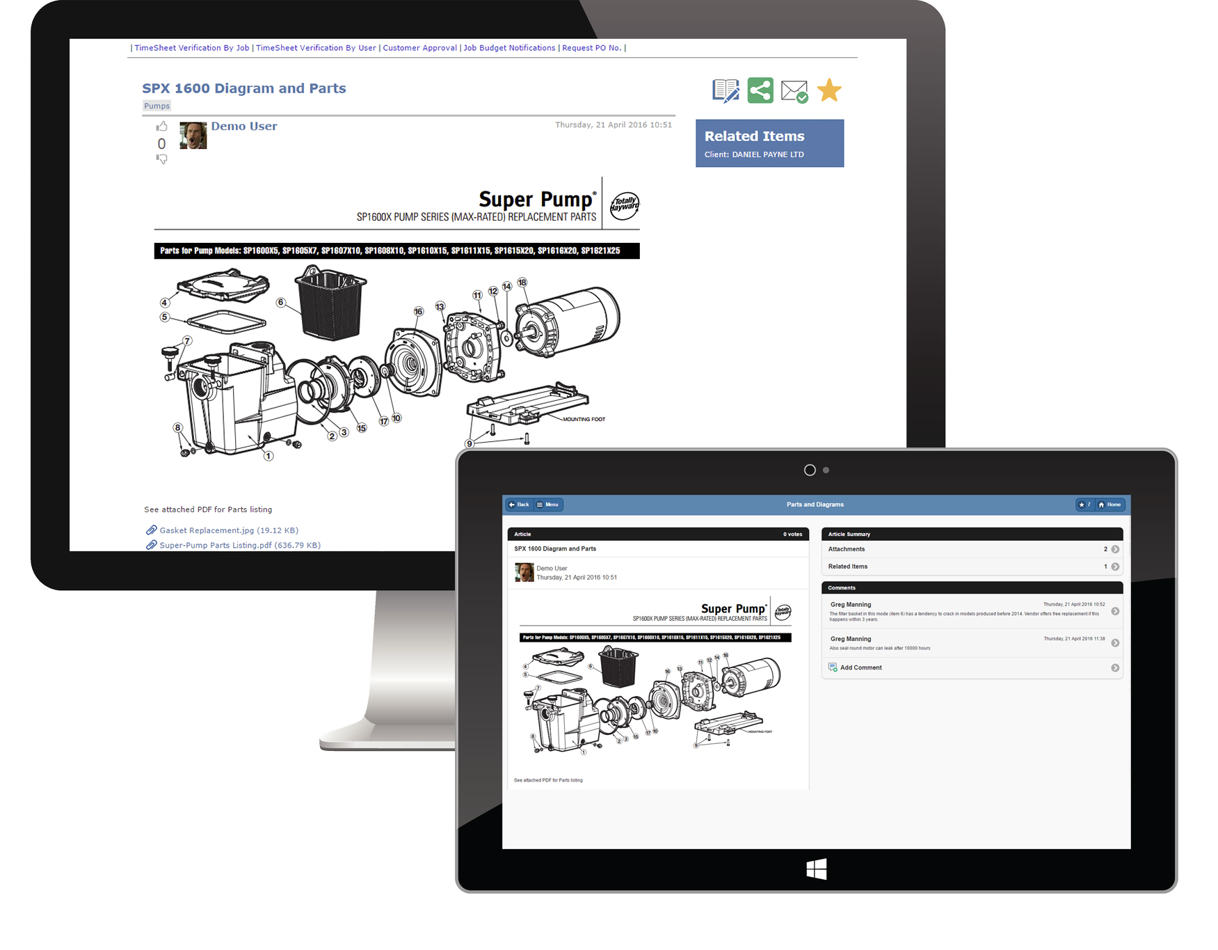 Full asset history, details of upcoming services, add attachments such as manuals or photos - all of this can be made available to staff in the office or the field, and even customers.